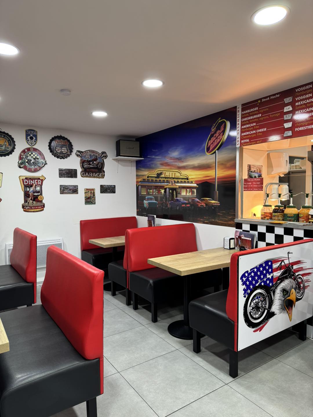 Comptoir à damier noir et blanc, banquettes rouges confortables, décoration vintage avec plaques émaillées et affiches Route 66 : tout est pensé pour une expérience unique. En cuisine, des burgers au steak haché frais, des paninis bien garnis et des assiettes copieuses préparées avec soin.
