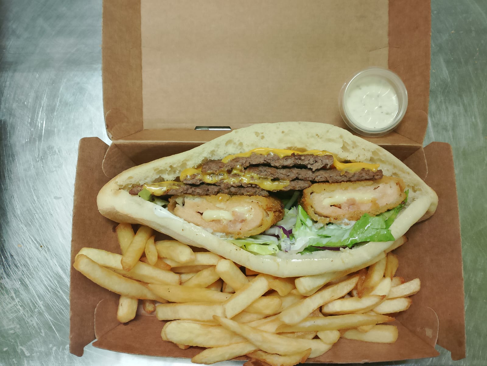 Nous préparons chaque commande avec soin : des pizzas généreuses cuites au four, des burgers smash gourmands, des tacos bien garnis et des kebabs savoureux. Le tout 100 % halal, pour que tout le monde puisse se régaler.